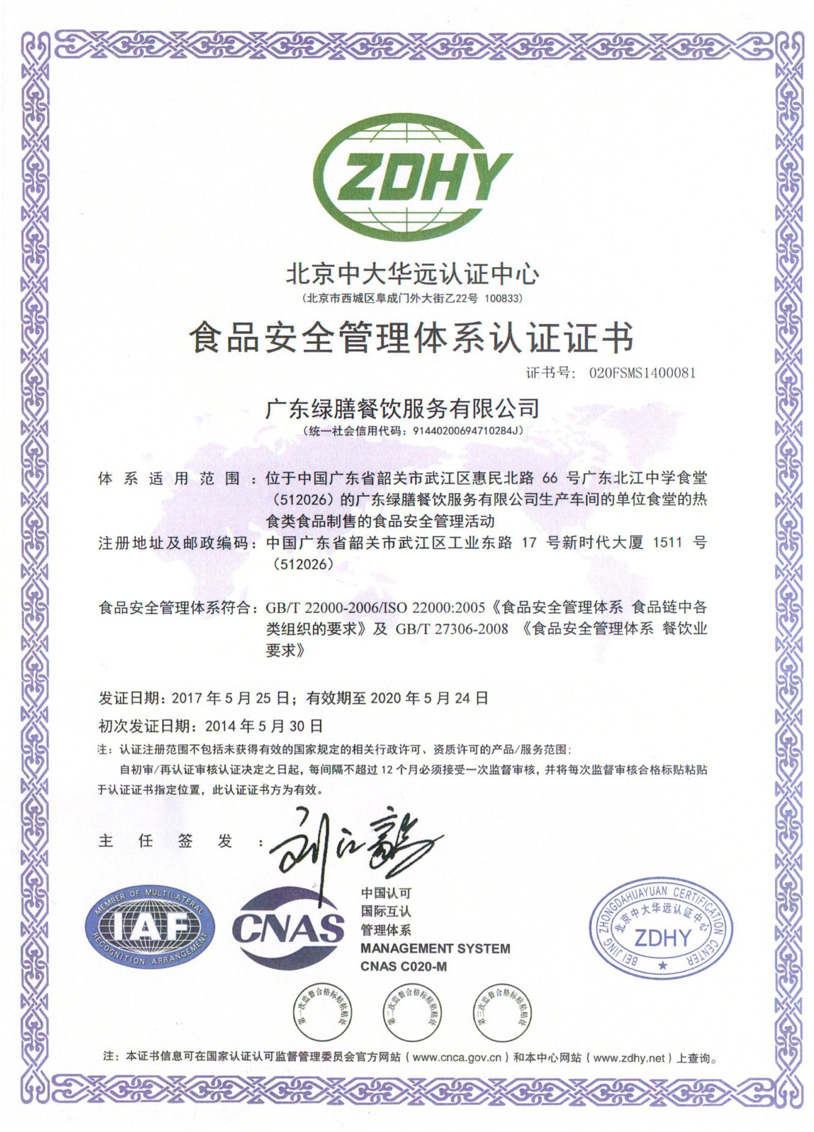 ISO22000:2005食品安全管理体系认证证书